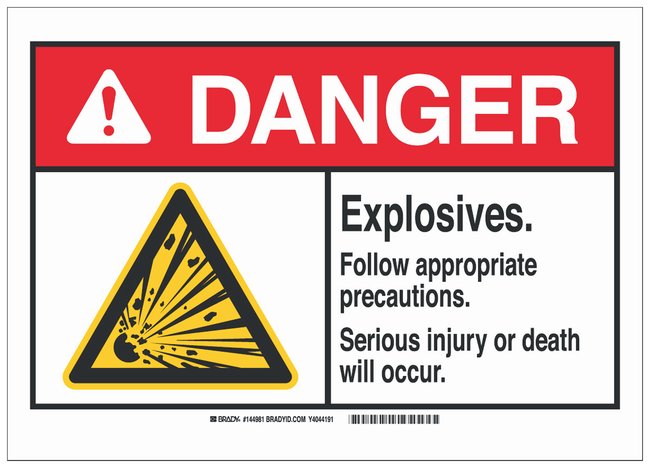 Aluminum Warning Sign: EXPLOSIVES. FOLLOW APPROPRIATE PRECAUTIONS. SERIOUS INJURY OR DEATH WILL OCCUR, Each