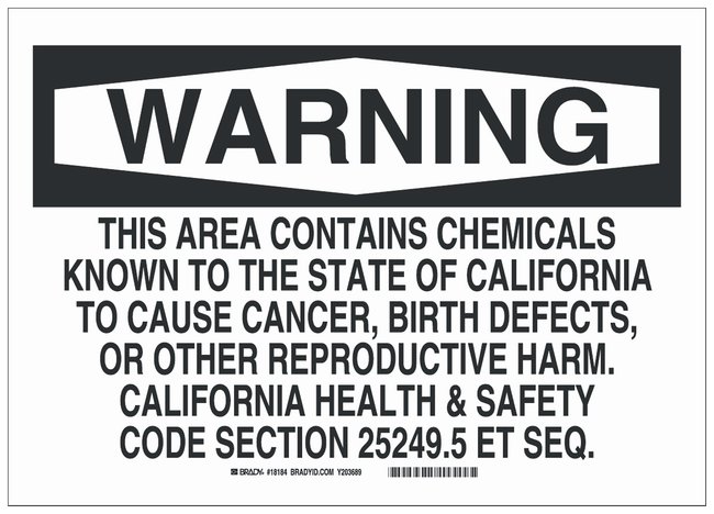 Aluminum Warning Sign: THIS AREA CONTAINS CHEMICALS KNOWN TO THE STATE OF CALIFORNIA TO CAUSE CANCER, BIRTH DEFECTS, OR OTHER REPRODUCTIVE HARM, Each