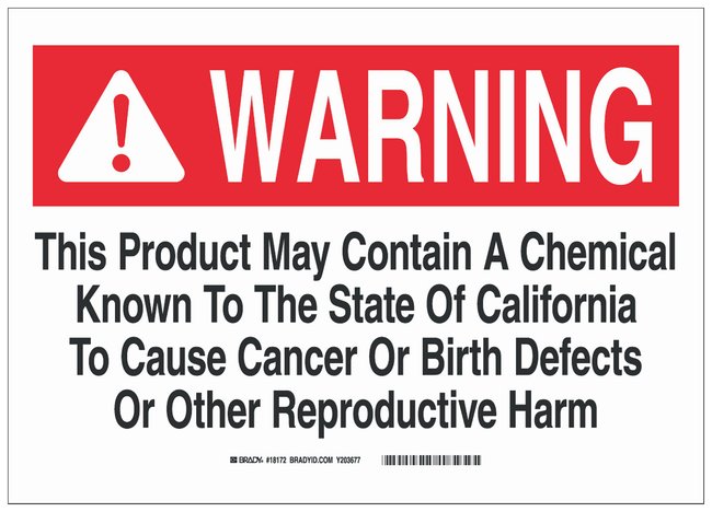 Aluminum Warning Sign: THIS PRODUCT MAY CONTAIN A CHEMICAL KNOWN TO THE STATE OF CALIFORNIA TO CAUSE CANCER OR BIRTH DEFECTS OR OTHER REPRODUCTIVE HARM, Each