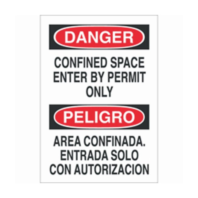 Bilingual Signs: DANGER CONFINED SPACE ENTER BY PERMIT ONLY, Communicates safety and facility information to Spanish speaking employees and visitors, Each