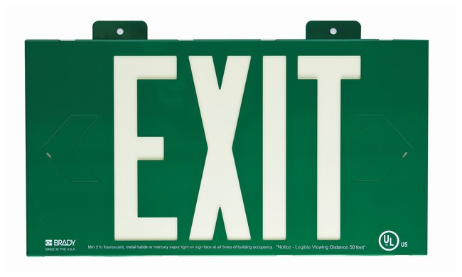 Legend: EXITMaterial: Glow-in-the-Dark BradyGlo PhotoluminescentLanguage: EnglishWall-mounted and maintenance-freeMay qualify for LEED credits and visibility 50 ft. (15.2m)W x H: 15.25 x 8.25 in. (38.7 x 21cm)CertificationsUL listed