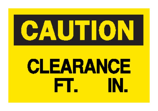 ldquo;Caution: Clearance Ft. In.” Signs, “Caution: Clearance Ft. In.” Signs to reinforce proper operational procedures, Each
