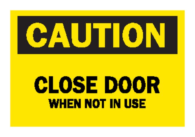 Bright colors and bold text provide high visibility to critical messagesLegend: CLOSE DOOR WHEN NOT IN USEHeader: CAUTIONBlack on YellowAvailable in different sizes and materialsB-302Self-sticking polyester — surface printed polyester, polyester overlaminate and sensitive acrylic