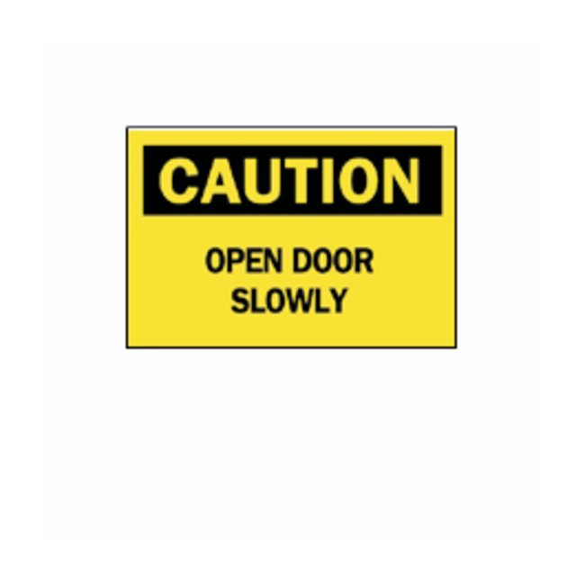 Bright colors and bold text provide high visibility to critical messagesLegend: OPEN DOOR SLOWLYHeader: CAUTIONBlack on YellowAvailable in different sizes and materialsB-401Plastic — high-impact polystyreneB-302Self-sticking polyester — surface printed polyester, polyester overlaminate and sensitive acrylic