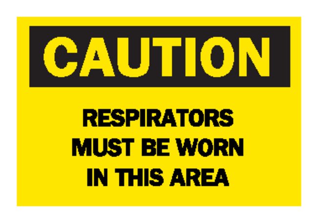 Bright colors and bold text provide high visibility to critical messagesLegend: RESPIRATORS MUST BE WORN IN THIS AREAHeader: CAUTIONBlack on YellowAvailable in different sizes and materialsB-302Self-sticking polyester — surface printed polyester, polyester overlaminate and sensitive acrylicB-401Plastic — high-impact polystyrene