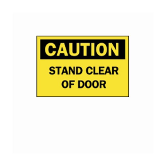 Bright colors and bold text provide high visibility to critical messagesLegend: STAND CLEAR OF DOORHeader: CAUTIONBlack on YellowAvailable in different sizes and materialsB-401Plastic — high-impact polystyreneB-302Self-sticking polyester — surface printed polyester, polyester overlaminate and sensitive acrylic