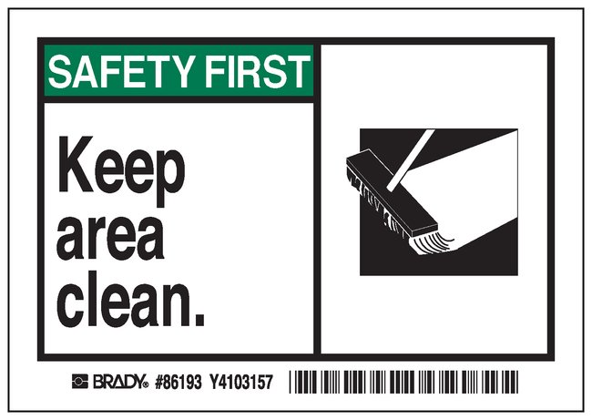 Machine/Equipment Label, Header: SAFETY FIRST, Legend: KEEP AREA CLEAN, Pack of 5