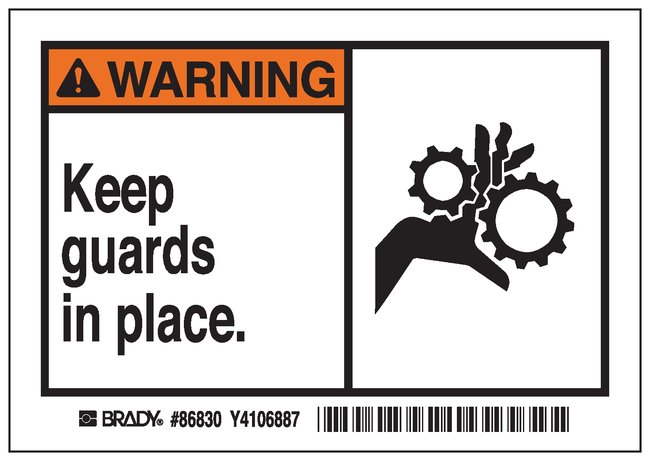Machine/Equipment Label, Header: WARNING, Legend: KEEP GUARDS IN PLACE, Pack of 5