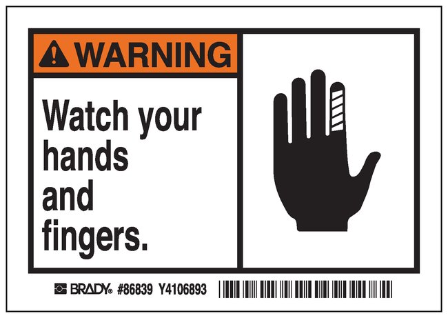 Machine/Equipment Label, Header: WARNING, Legend: Watch your hands and fingers, Pack of 5