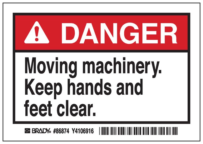 Machine/Equipment Label, Header: DANGER, Legend: MOVING MACHINERY KEEP HANDS AND FEET CLEAR, Pack of 5