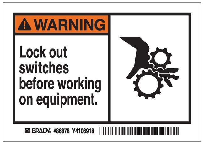 Machine/Equipment Label, Header: WARNING, Legend: Lock out switches……equipment, Pack of 5