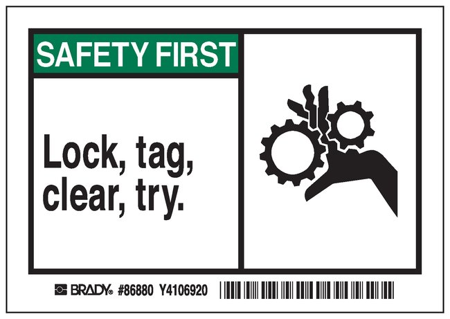 Machine/Equipment Label, Header: SAFETY FIRST, Legend: Lock, tag, clear, try, Pack of 5