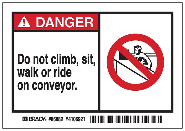 Machine/Equipment Label, Header: DANGER, Legend: Do not climb, sit, walk or ride on conveyor, Pack of 5
