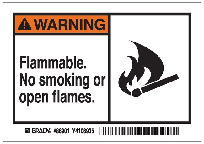 Machine/Equipment Label, Header: WARNING, Legend: Flammable No smoking or open flames, Pack of 5