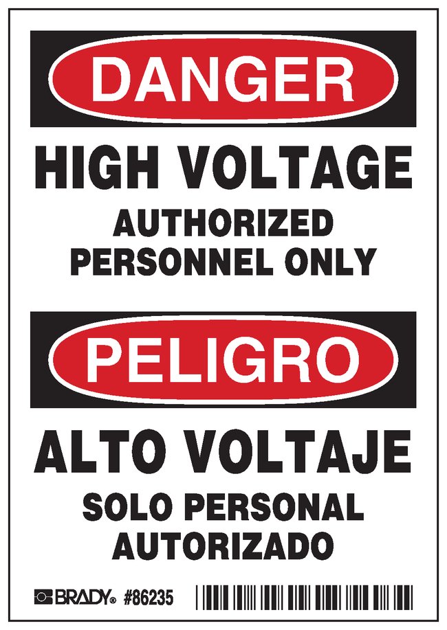 Machine/Equipment Label, Header: DANGER/PELIGRO, Legend: HIGH VOLTAGE……ONLY/ALTO VOLTAJE, Pack of 5