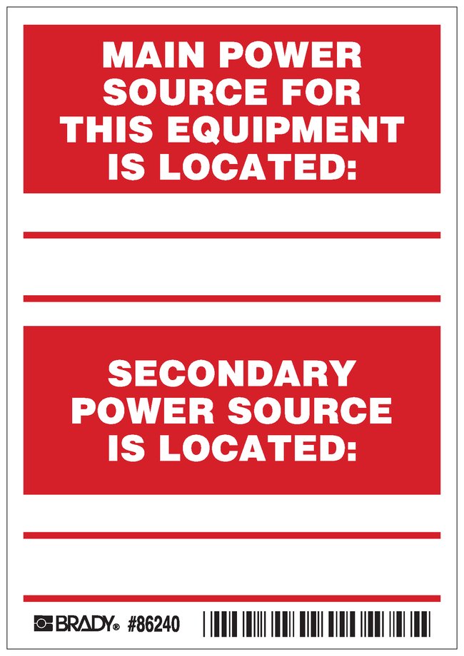 Machine/Equipment Label, Header: No Header, Legend: MAIN POWER SOURCE………IS LOCATED: S, Pack of 5