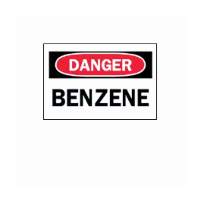 Bright colors and bold text provide high visibility to critical messagesSign reads “DANGER BENZENE”Black/red on whiteDesigned to withstand harsh industrial environmentsAvailable in different sizes and material