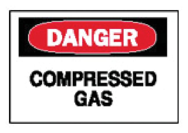 Bright colors and bold text provide high visibility for critical messagesSign reads “DANGER COMPRESSED GAS”Black/red on whiteDesigned to withstand harsh industrial environmentsAvailable in different sizes and materialsB-401Plastic — high-impact polystyreneB-120Premium fiberglass — fiberglass reinforced polyesterB-555Aluminum — 0.1cm (0.040 in.) coil coated aluminum constructionB-302Self-sticking polyester — surface printed polyester, polyester overlaminate and sensitive acrylic