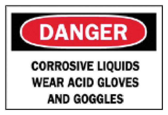 Designed to withstand harsh industrial environmentsBright colors and bold text provide high visibility to critical messagesSign reads “DANGER CORROSIVE LIQUIDS WEAR ACID GLOVES AND GOGGLES”Black/red on whiteSize H × W: 25.4 × 35.56cm (10 × 14 in.)B-555 aluminum — 0.040 in. coil coated aluminum constructio