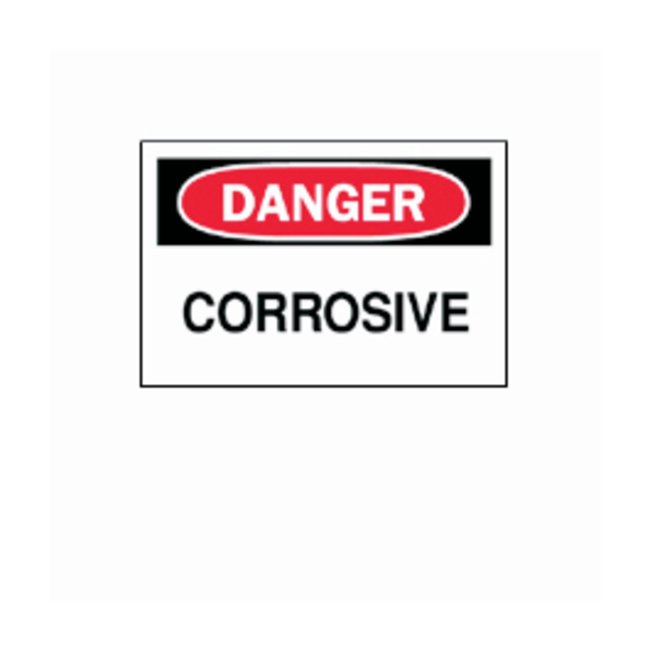 Bright colors and bold text provide high visibility to critical messagesSign reads DANGER CORROSIVEBlack/red on whiteDesigned to withstand harsh industrial environmentsAvailable in different sizes and materialsB-401Plastic — high-impact polystyreneB-120Premium fiberglass — fiberglass reinforced polyesterB-302Self-sticking polyester — surface printed polyester, polyester overlaminate and sensitive acrylic