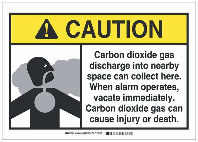 Fiberglass Caution Sign: CARBON DIOXIDE GAS DISCHARGE INTO NEARBY SPACE CAN COLLECT HERE. WHEN ALARM OPERATES, VACATE IMMEDIATELY. CARBON DIOXIDE GAS CAN CAUSE INJURY OR DEATH, Improve workplace safety with proper signage. The Caution Sign is a durable, clear and effective tool to properly mark appropriate areas and to help prevent workplace injury, Each