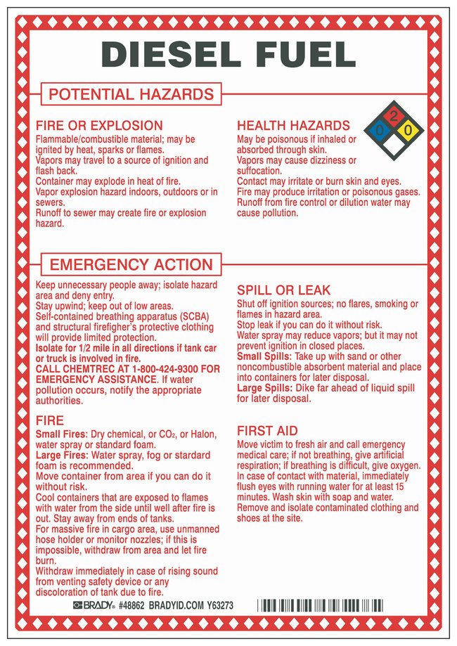 Fiberglass Hazard Sign: DIESEL FUEL POTENTIAL HAZARDS, Each