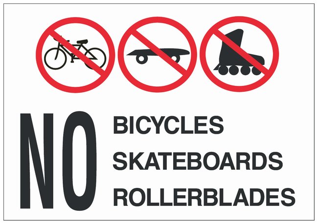 Fiberglass Prohibited Activity Sign: NO BICYCLES SKATEBOARDS ROLLERBLADES, Each