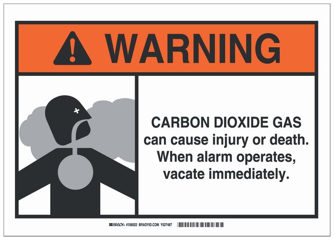 Fiberglass Warning Sign: CARBON DIOXIDE GAS CAN CAUSE INJURY OR DEATH. WHEN ALARM OPERATES, VACATE IMMEDIATELY, Each