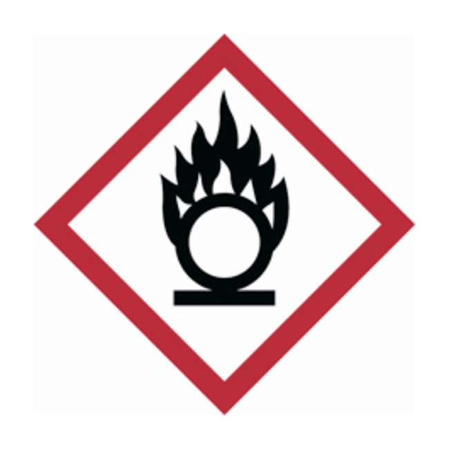 Pre-printed die cut labels identify hazardous products for chemical risks, health risks and environmental risks in accordance to the United Nations' universal approach to classifying and communicating chemical hazardsLegend: OxidizingMade of B-7569 VinylAvailable in three size
