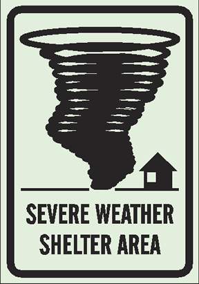 Glow-In-The-Dark Exit and Directional Signs: SEVERE WEATHER SHELTER AREA w/Tornado Picto, Each