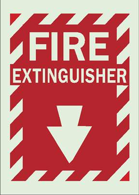 Available in Glow-In-The-Dark Self-Stick Polyester and Glow-In-The-Dark Self-Stick Plastic materialsLegend: FIRE EXTINGUISHER (W/PICTO)