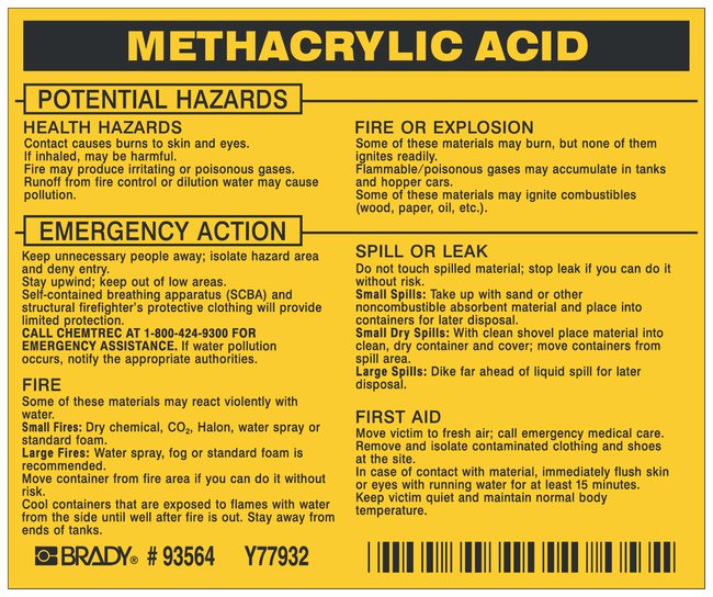 Hazardous Material Label: METHACRYLIC ACID, Pack of 25