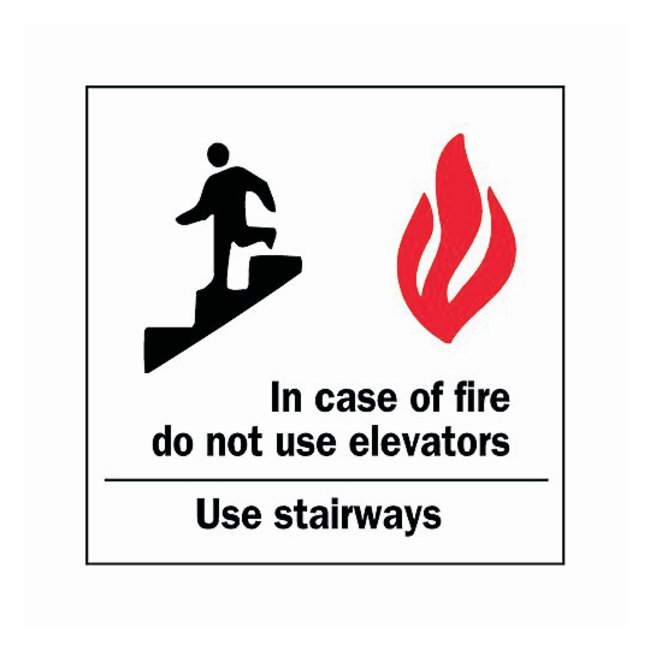 Bright colors and bold text provide high visibility to critical messagesLegend: IN CASE OF FIRE DO NOT USE ELEVATORS...etc (W/PICTO)Black on WhiteAvailable in different sizes and materialsB-401Plastic — high-impact polystyreneB-302Self-sticking polyester — surface printed polyester, polyester overlaminate and sensitive acrylic