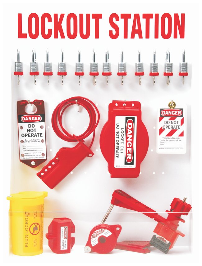Large Lockout Station withComponents and 12 Steel Padlocks, 25 Tags includes components needed to lock out most types of electrical control points.