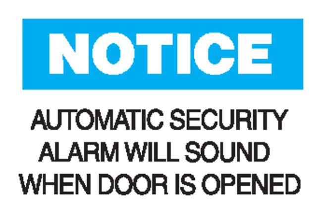Bright colors and bold text provide high visibility to critical messagesLegend: AUTOMATIC SECURITY ALARM WILL SOUND WHEN DOOR IS OPENEDHeader: NOTICEBlack/Blue on WhiteAvailable in different sizes and materialsB-401Plastic — high-impact polystyreneB-302Self-sticking polyester — surface printed polyester, polyester overlaminate and sensitive acrylic