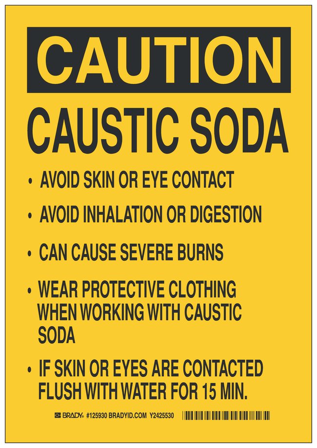 Polyester Caution Sign: CAUSTIC SODA AVOID SKIN OR EYE CONTACT … WEAR PROTECTIVE CLOTHING WHEN WORKING … FLUSH WITH WATER FOR 15 MIN, Each
