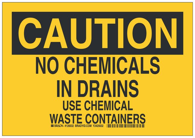 Polyester Caution Sign: NO CHEMICALS IN DRAINS USE CHEMICAL WASTE CONTAINERS, Each