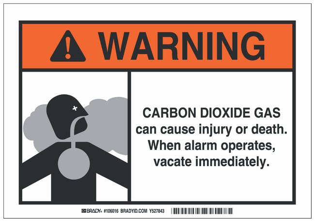 Polyester Warning Sign: CARBON DIOXIDE GAS CAN CAUSE INJURY OR DEATH. WHEN ALARM OPERATES, VACATE IMMEDIATELY, Each