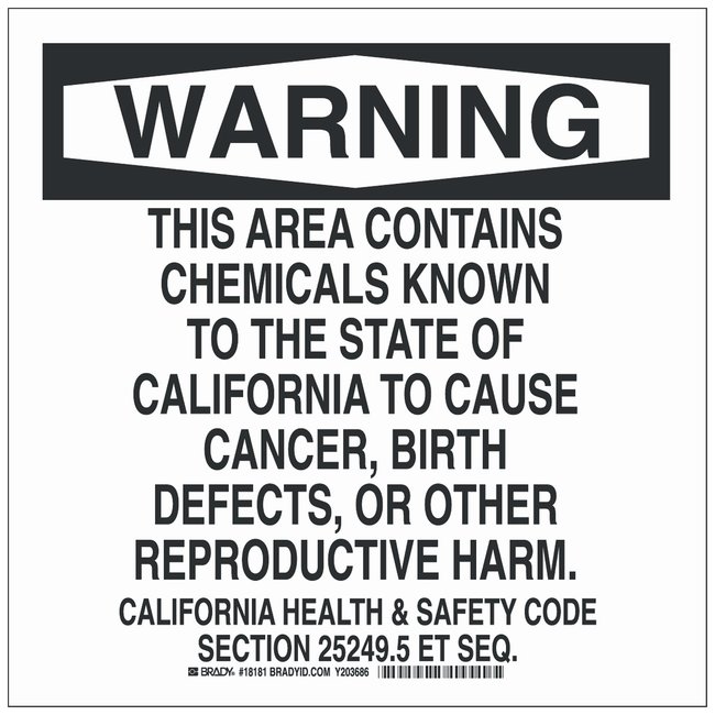 Polyester Warning Sign: THIS AREA CONTAINS CHEMICALS KNOWN TO THE STATE OF CALIFORNIA TO CAUSE CANCER, BIRTH DEFECTS, OR OTHER REPRODUCTIVE HARM, Each