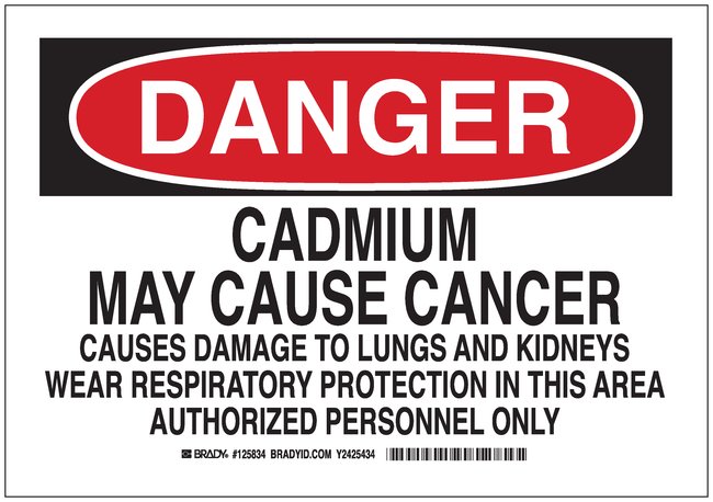 Polystyrene Danger Sign: CADMIUM MAY CAUSE CANCER CAUSES DAMAGE TO LUNGS AND KIDNEYS WEAR RESPIRATORY PROTECTION IN THIS AREA AUTHORIZED PERSONNEL ONLY, Each