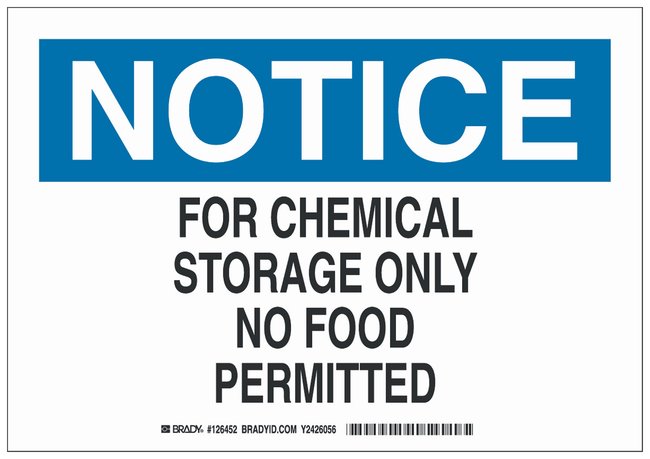 Polystyrene Notice Sign: FOR CHEMICAL STORAGE ONLY NO FOOD PERMITTED, Each