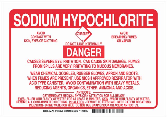 Polystyrene Sodium Hypochlorite Sign: DANGER AVOID CONTACT WITH SKIN, EYES OR CLOTHING CORROSIVE DO NOT TAKE INTERNALLY AVOID BREATHING FUMES OR VAPOR, Each