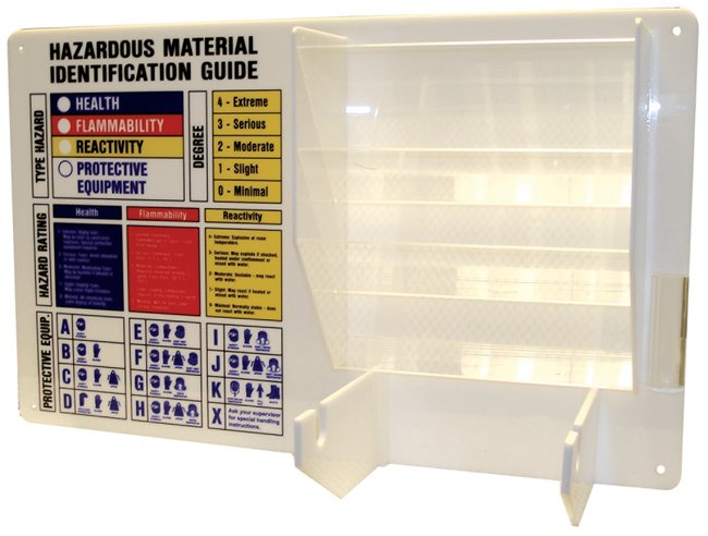 Six 3/4 in. pockets for holding sheet labelsOne 5 in. dowel to hold label rollsIncludes a pen holderProvides hazard rating informationprinted on board