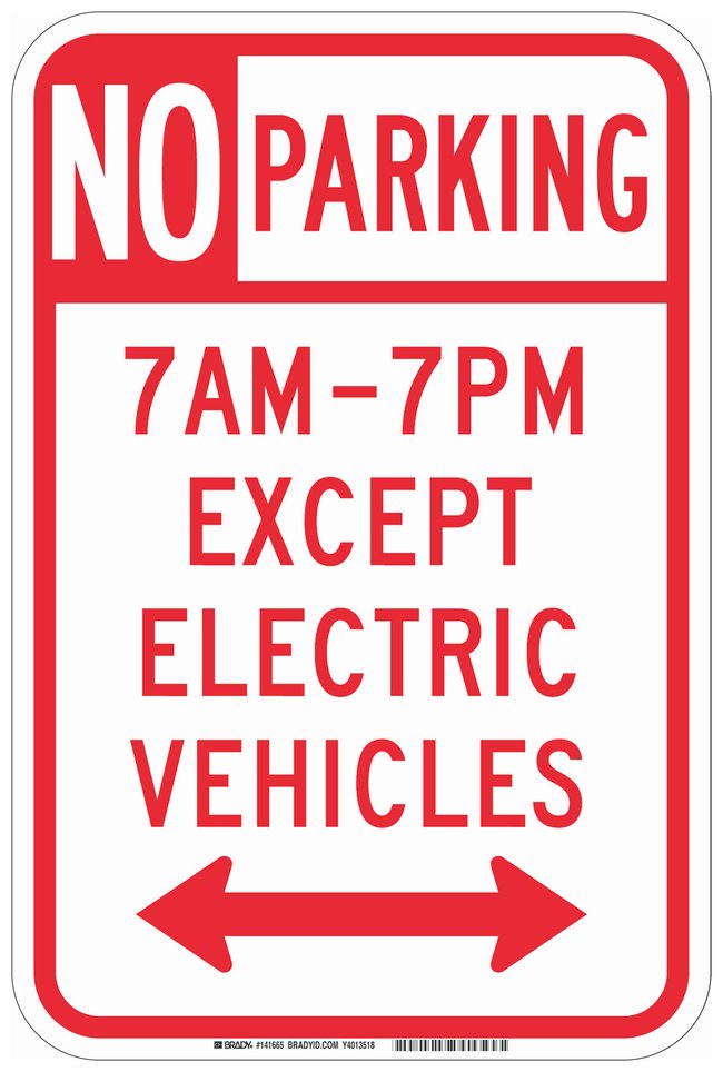 Reflective Aluminum Parking Sign: NO PARKING 7AM-7PM EXCEPT ELECTRIC VEHICLES, dual arrow, Each