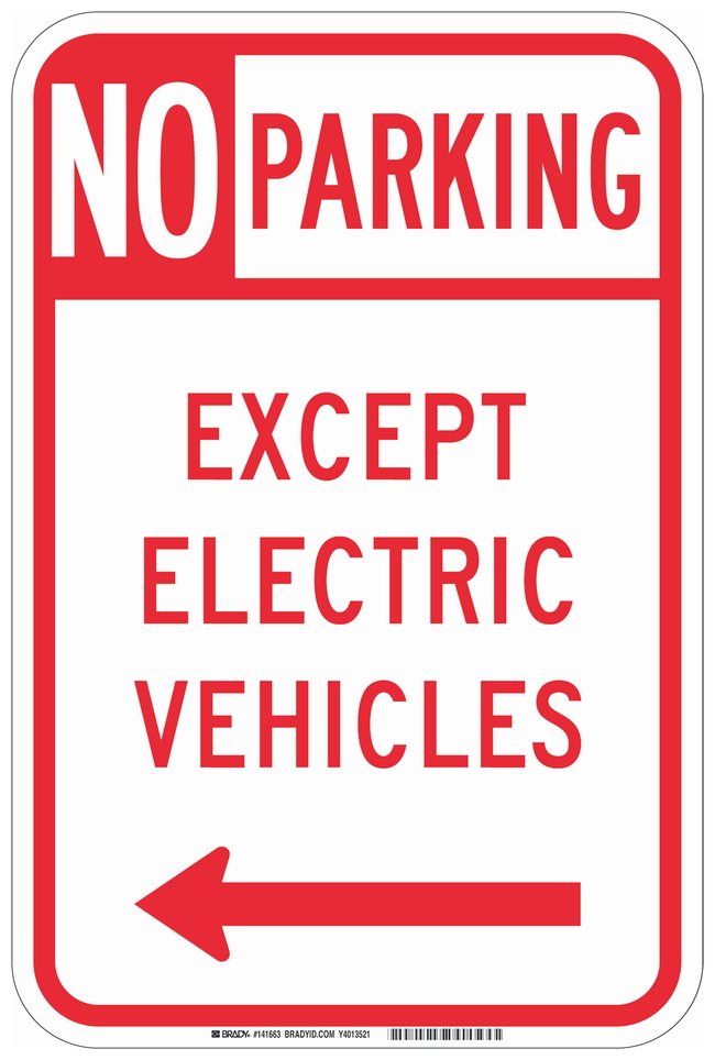 Reflective Aluminum Parking Sign: NO PARKING EXCEPT ELECTRIC VEHICLES, left arrow, Each