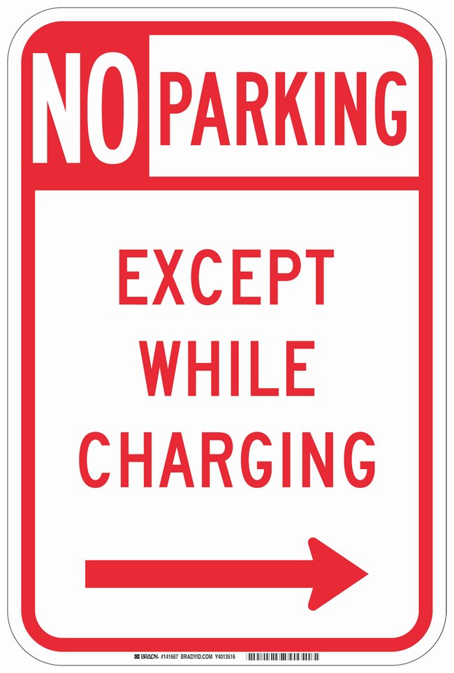 Reflective Aluminum Sign: NO PARKING EXCEPT WHILE CHARGING, right arrow, Each
