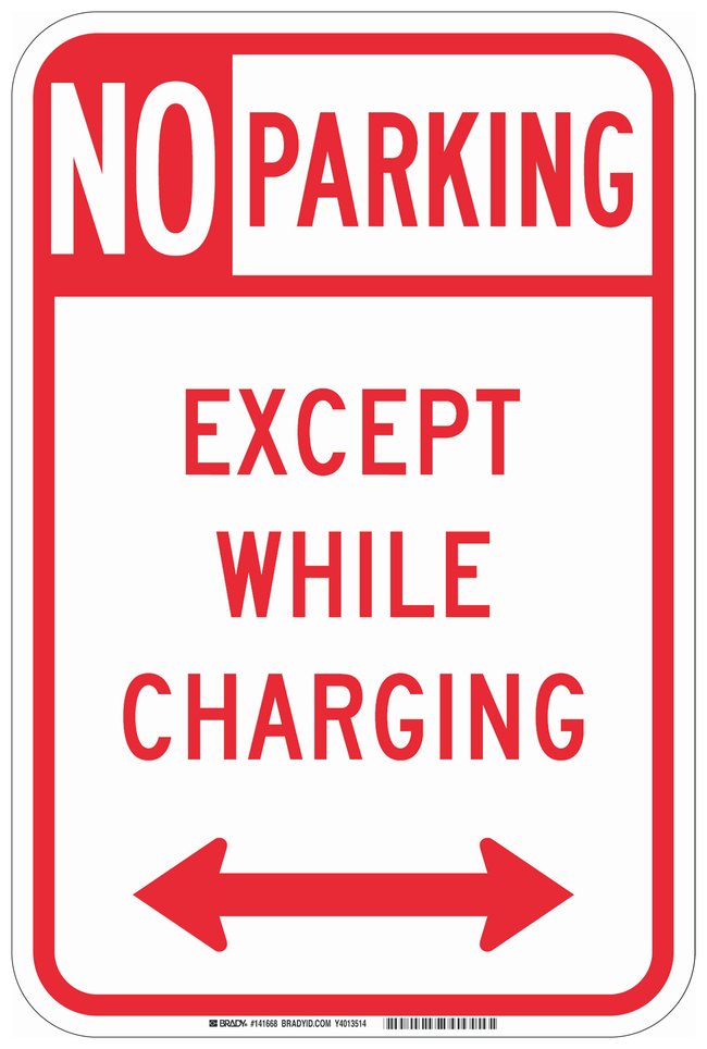 Reflective Aluminum Sign: NO PARKING EXCEPT WHILE CHARGING, right arrow, Each