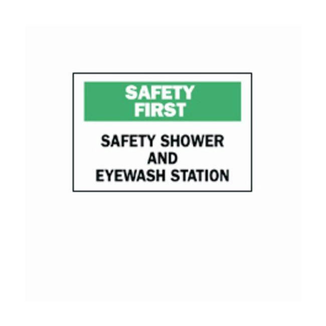 Reinforces safe work practices and ensure that employees are prepared for accidents and emergenciesSign reads “SAFETY FIRST - SAFETY SHOWER AND EYE WASH STATION”Green/black on whiteAvailable in different sizes and material