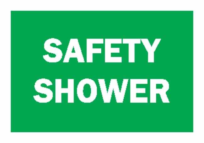 Bright colors and bold text provide high visibility to critical messagesLegend: SAFETY SHOWERWhite on GreenAvailable in different sizes and materialsB-120Premium Fiberglass: reinforced polyester sign panel with protected graphicsB-401Plastic — high-impact polystyreneB-302Self-sticking polyester — surface printed polyester, polyester overlaminate and sensitive acrylic