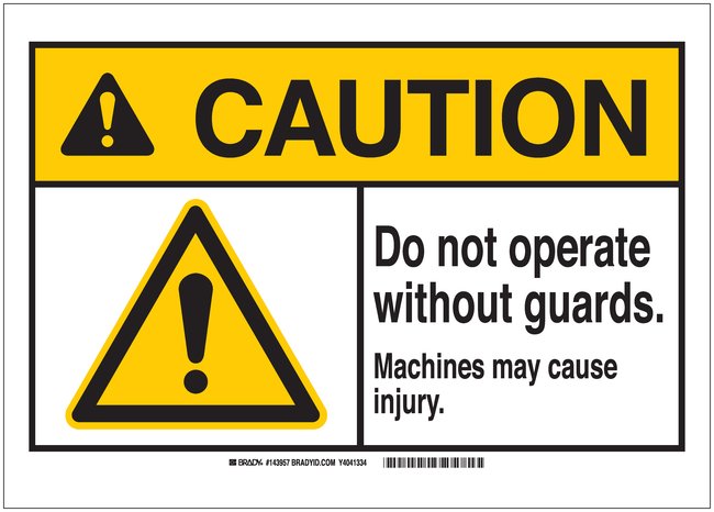 CAUTION: DO NOT OPERATE WITHOUT GUARDS—MACHINES MAY CAUSE INJURY signs communicate warning messages about the potential dangers of operating machinery and equipment in a facility. Signs remind employees about safety, risks, proper operating instructions and more.
